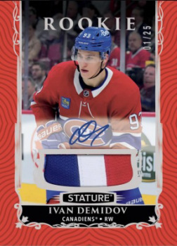 • Collector-favorite Stature Hockey is back with its elegantly-designed cards on thick, brilliant rainbow foil-like styrene stock!! Sporting a bevy of Veteran, Legend and Rookie cards featuring a hard-signed autograph and/or a game-worn patch swatch, 2025-26 Stature will appeal to high-end, autograph, rookie and player collectors alike. The product consists solely of the Base Set and a multitude of amazing parallels.